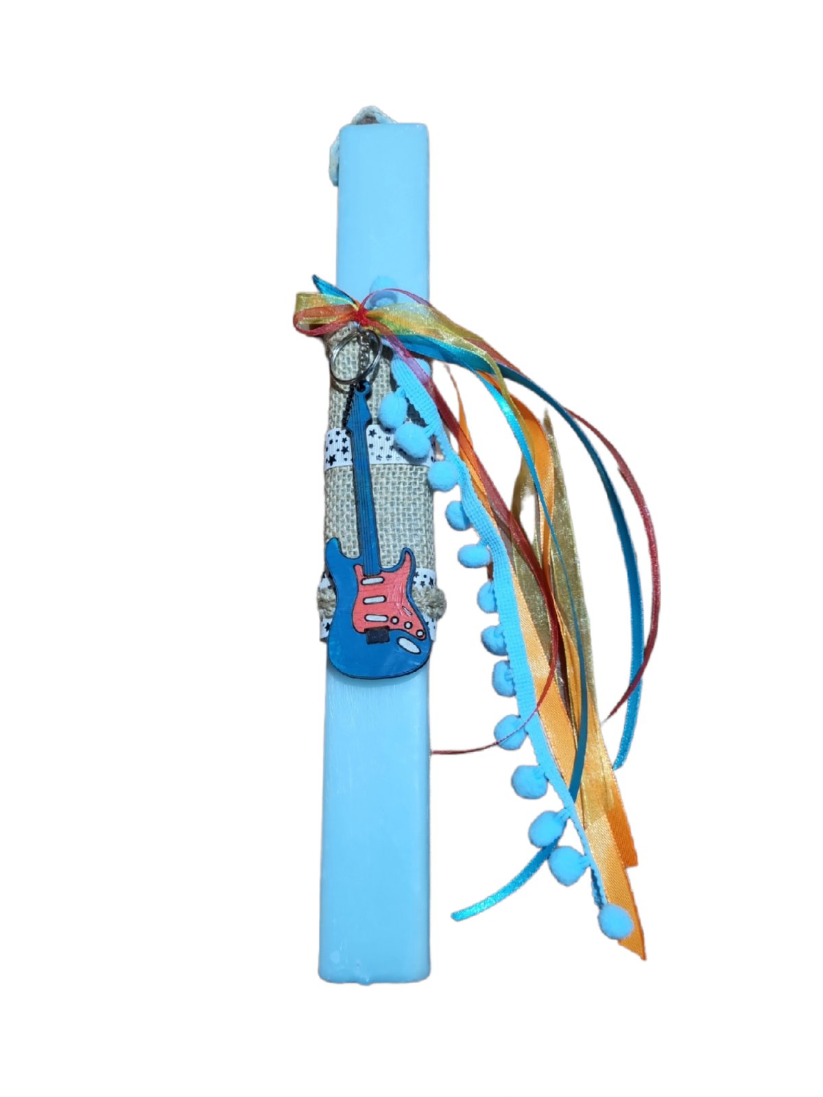 Περιγραφή: λαμπάδα πολυτελείας με πλακέ χειροποίητο γαλάζιο αρωματικό κερί.